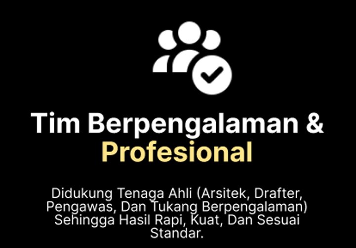 Didukung tenaga ahli (arsitek, drafter, pengawas, dan tukang berpengalaman) sehingga hasil rapi, kuat, dan sesuai standar.